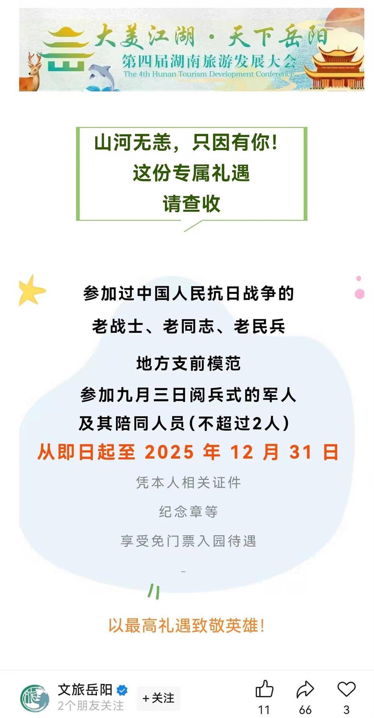 “山河无恙,只因有你!以最高礼遇致敬英雄!”近日,湖南省岳阳市文化旅游广电局官方微信“文旅岳阳”发布《2025年在岳阳,这些最可爱的人全部免票》政策消息,为纪念中国人民抗日战争暨世界反法西斯战争胜利80周年,从即日起至2025年12月31日,岳阳所有A级以上景区(58家,含岳阳中华大熊猫苑)对参加过中国人民抗日战争的老战士、老同志、老民兵、地方支前模范和参加九月三日阅兵式的军人,及其陪同人员(不超过2人)实行免大门票政策,凭本人相关证件、纪念章等享受免门票入园待遇。