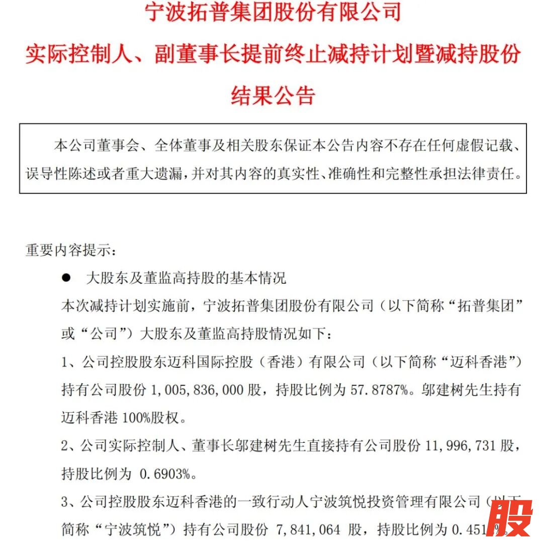 近日,机器人概念牛股拓普集团实控人父子的减持事件,引发股民热议。父子儿子卖出349万多股,唯独留下1266股,然后发公告称减持计划提前终止了。