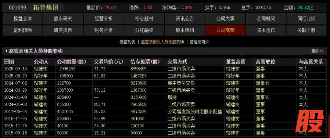 此外,9月10日晚间,拓普集团就公告过一次此次减持的相关公告。邬建树、邬好年以及父子二人的一致行动人宁波筑悦投资管理有限公司、宁波派舍置业有限公司于8月29日—9月10日期间通过集中竞价方式合计减持公司股份1343万股,占公司总股本的0.77%,套现约8.84亿元。